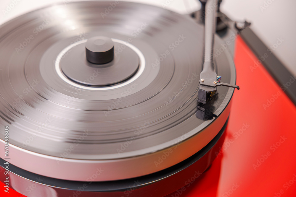 Close-up view of vinyl record player with spinning vinyl record, capturing essence of analog music.