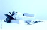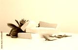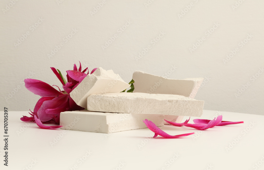 Stones platform podium, flower petal on beige background. Minimal empty display product presentation scene.