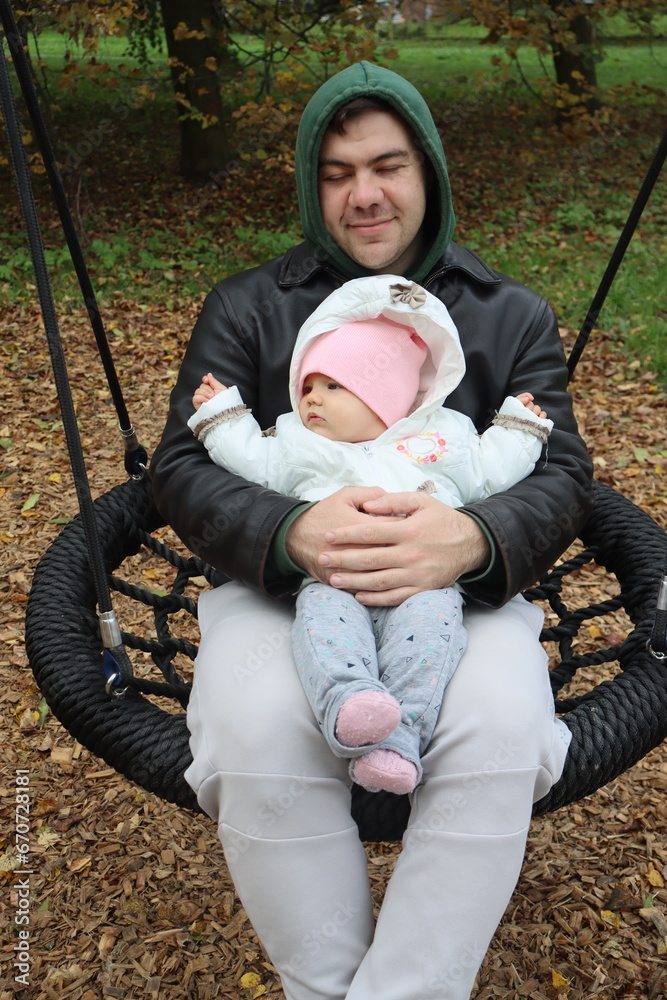 dad holds a little girl in his arms and rides on a swing in the park in autumn