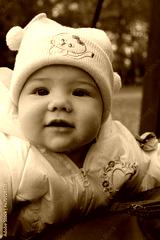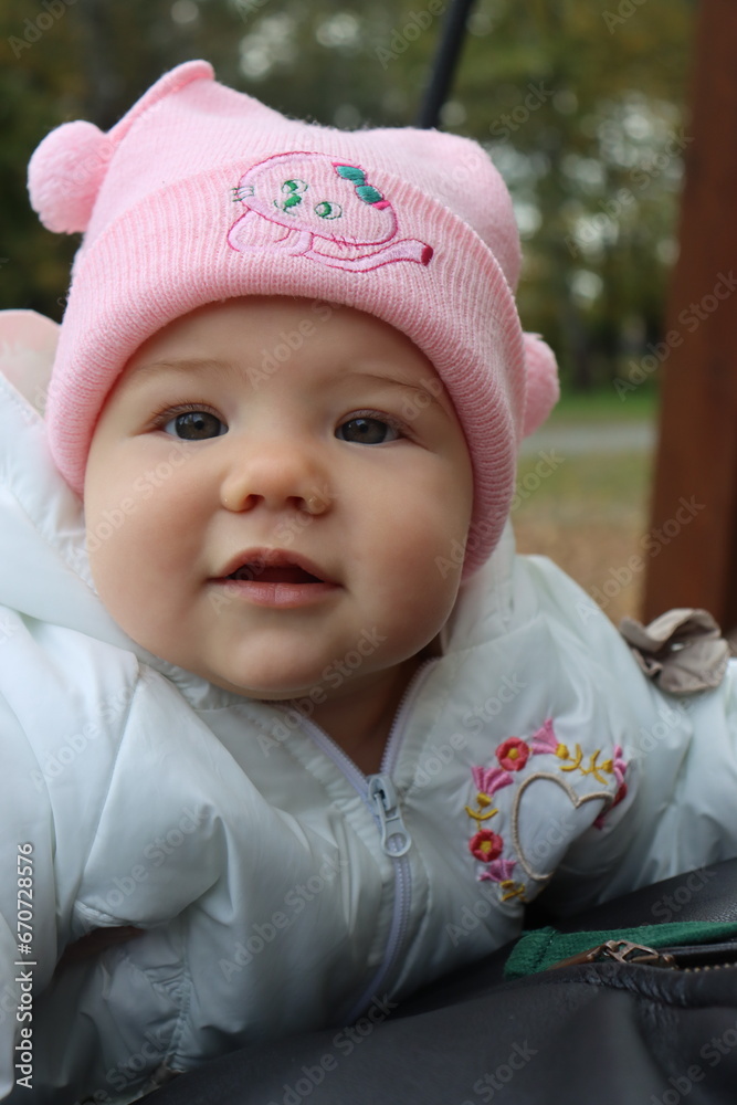 little girl 8 months old walks in an autumn park in Krakow in Poland