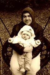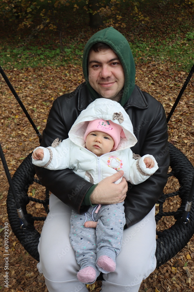 dad holds a little girl in his arms and rides on a swing in the park in autumn