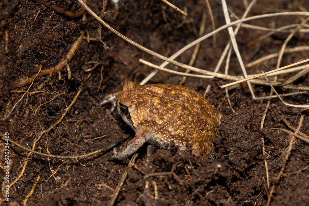 A Bushveld rain frog, also known as a common rain frog (Breviceps adspersus), using its hindlegs to dig a hole in the soil