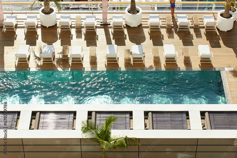 Swimming pool on roof top of yacht club in Monaco, premium spa recreation, Monte Carlo, palm tree, nobody