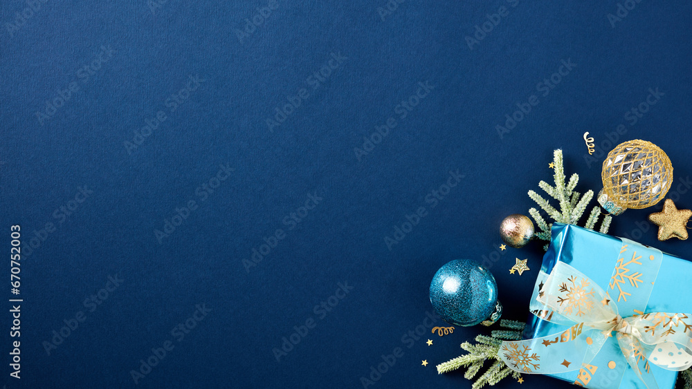 Luxury Xmas banner design. Dark blue Christmas background with gift box, fir branches, luxury ball ornaments.