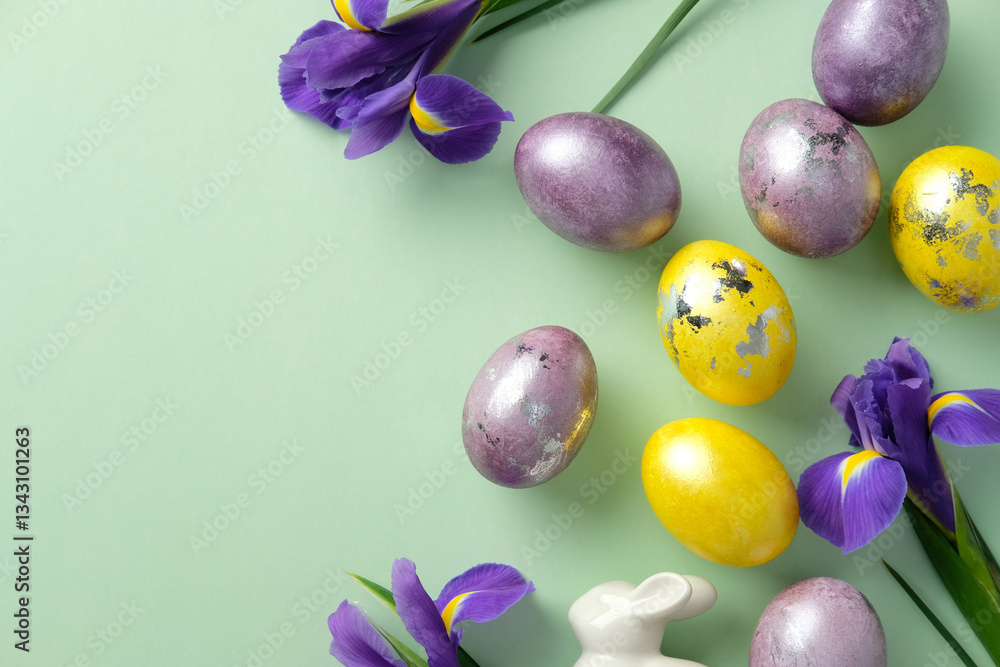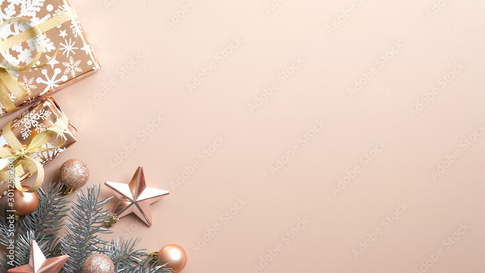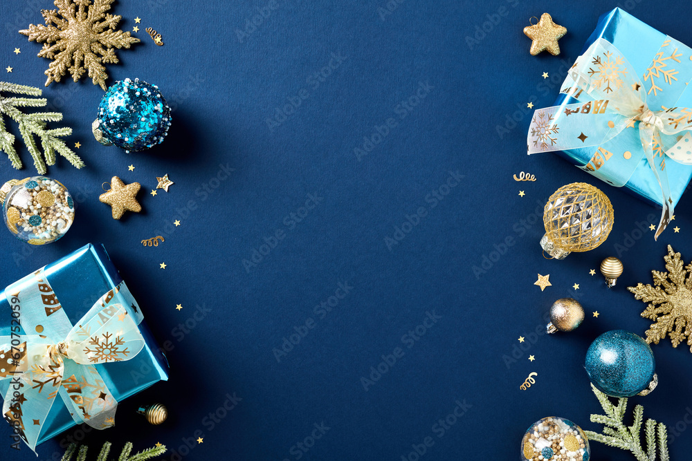 Christmas banner, greeting card template. Flat lay composition with glitter gift boxes, golden balls, decorations, fir branches on dark blue background. Top view.