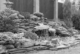 Landscape design in home garden, stones and waterfall in backyard