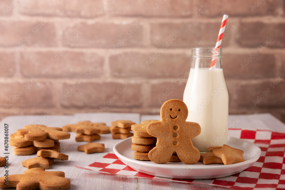 Homemade gingerbread man cookies and milk, traditionally made at Christmas and the holidays.