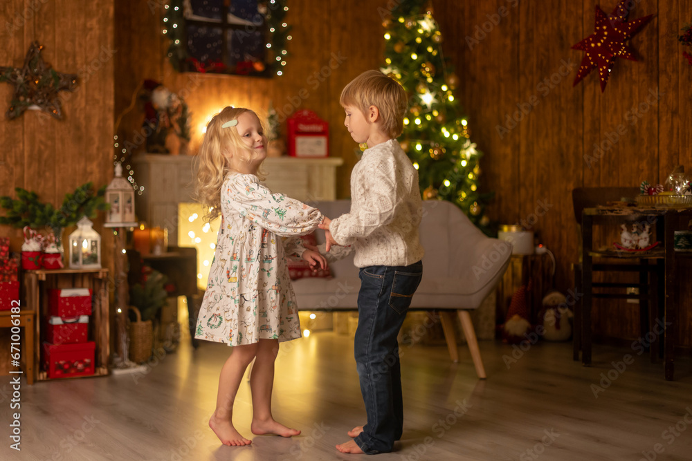 Beautiful children, blond kids, siblings, playing in decorated home for Christmas, enjoying holidays