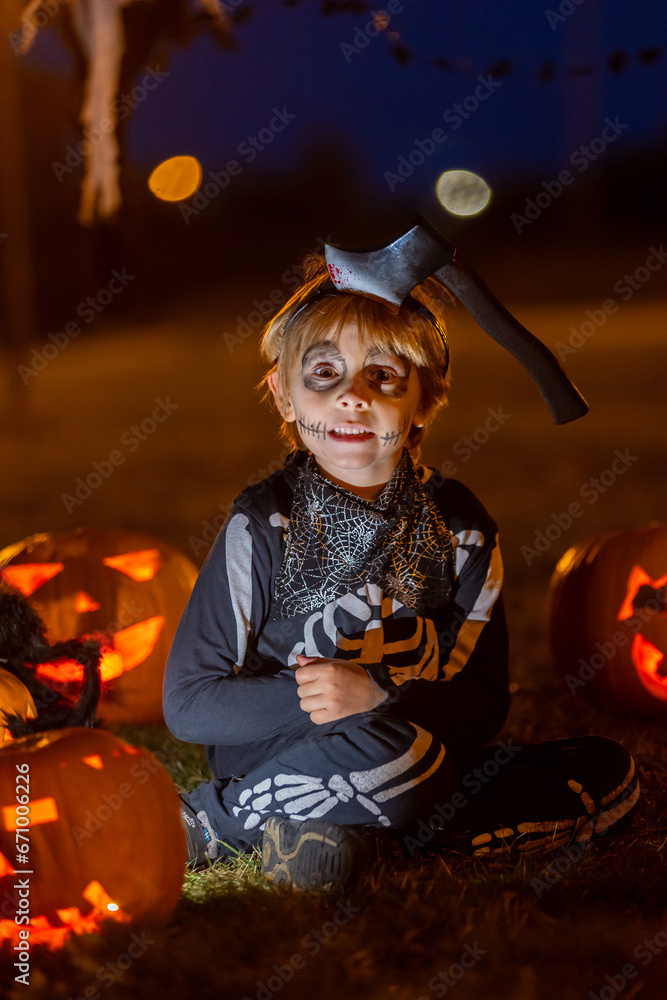 Two boys in the park with Halloween costumes, carved pumpkins with candles and decoration.