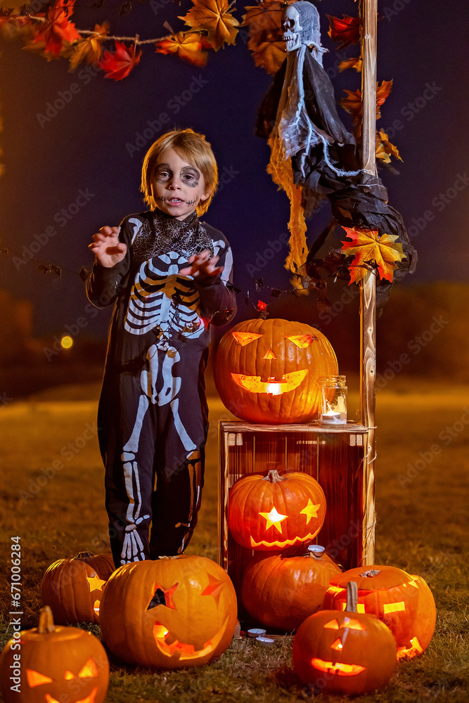 Two boys in the park with Halloween costumes, carved pumpkins with candles and decoration.