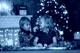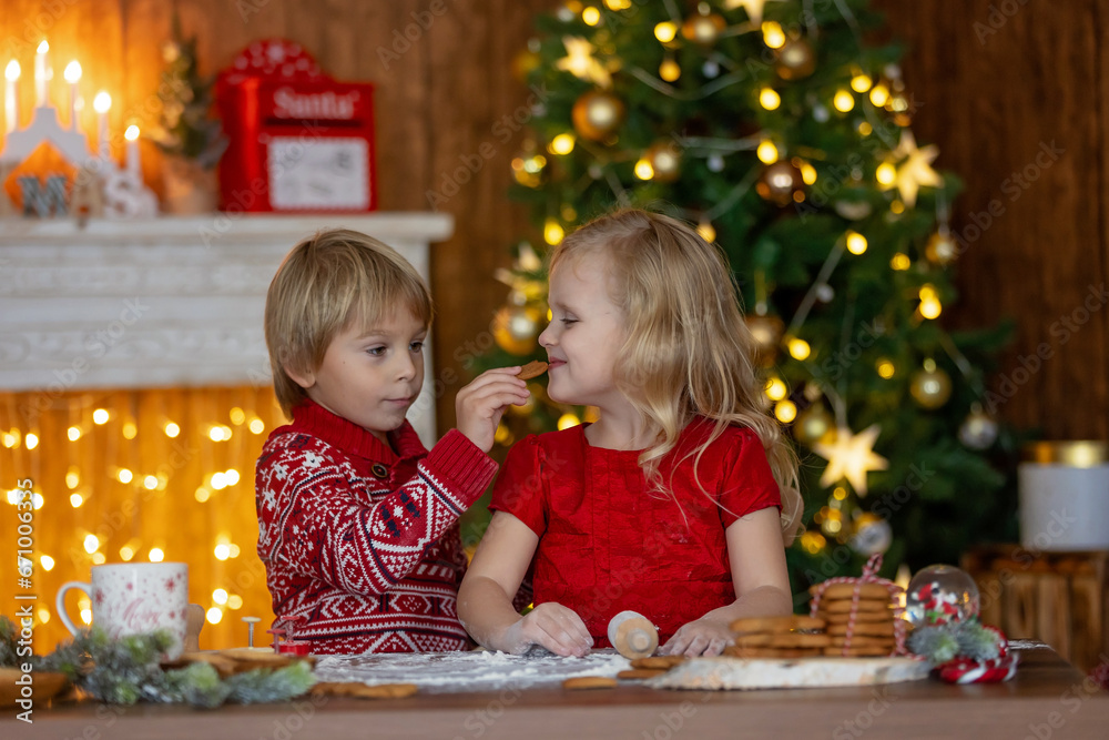 Beautiful children, blond kids, siblings, playing in decorated home for Christmas, enjoying holidays
