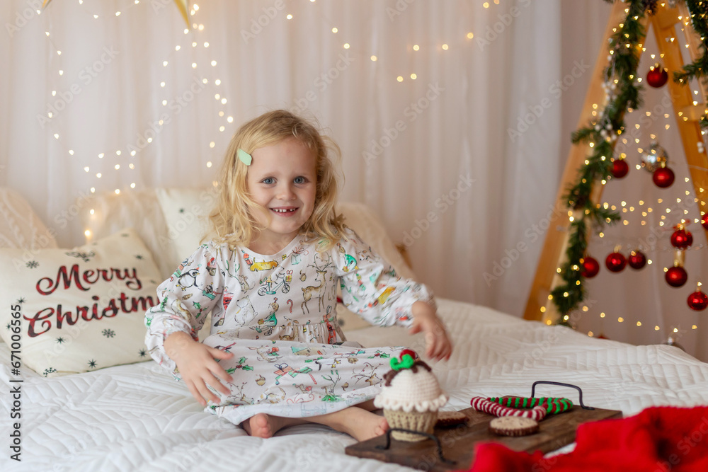 Beautiful children, blond kids, siblings, playing in decorated home for Christmas, enjoying holidays