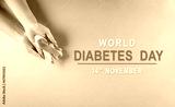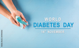 World diabetes day awareness concept. Hand holding blue ribbon, symbolic bow color raising awareness in diabetes day on pastel background, 14 November.