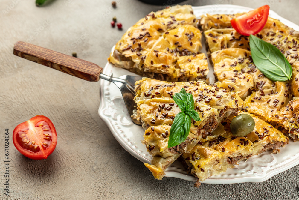 turkish pie with meat. burek pie. Food recipe background. Close up