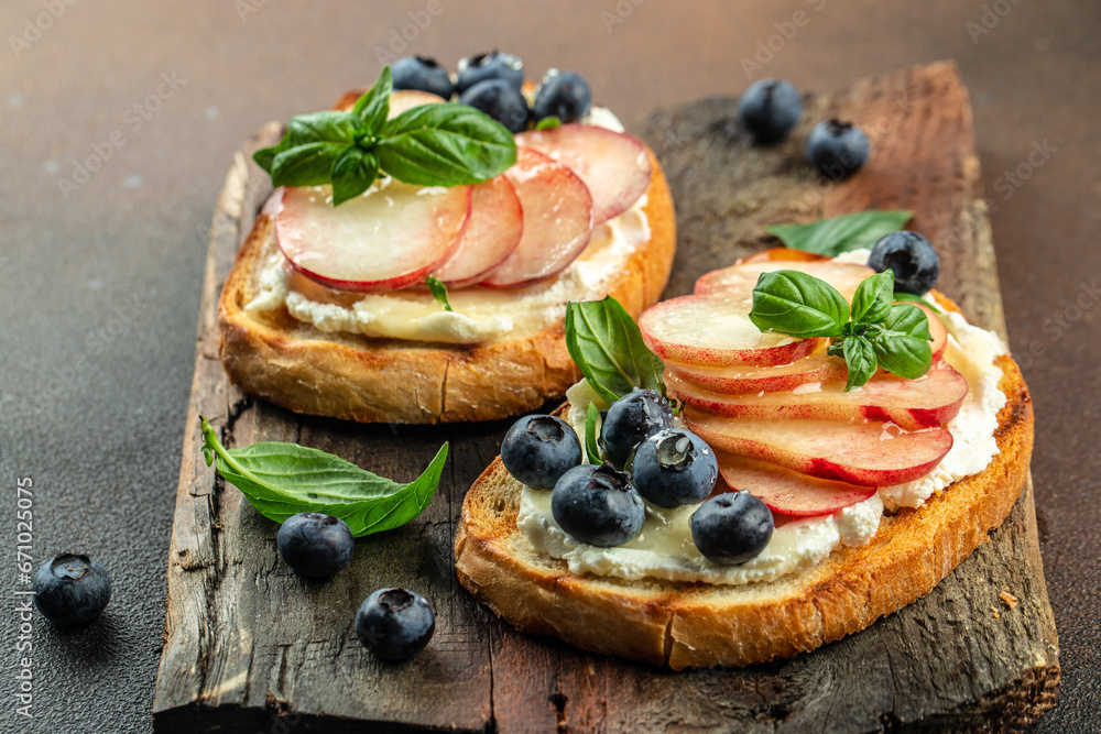Delicious toast with cream cheese, honey, peaches and blueberries. Concept healthy and balanced eating. place for text, top view