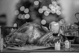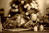Thanksgiving dinner, Thanksgiving turkey. Served table. Christmas turkey dinner. Baked turkey garnished with red berries in front of Christmas tree and burning candles. Roasted turkey table setting