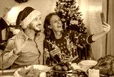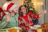 Family looking at camera selfie photo by smartphone in celebration party enjoy happy at dinner together with full food of turkey celebrate merry xmas in Christmas thanksgiving and New Year festive.