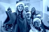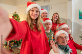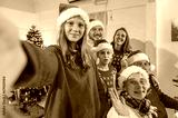 Family looking at camera selfie photo by smartphone in celebration party enjoy happy at dinner together with full food of turkey celebrate merry xmas in Christmas thanksgiving and New Year festive.