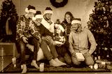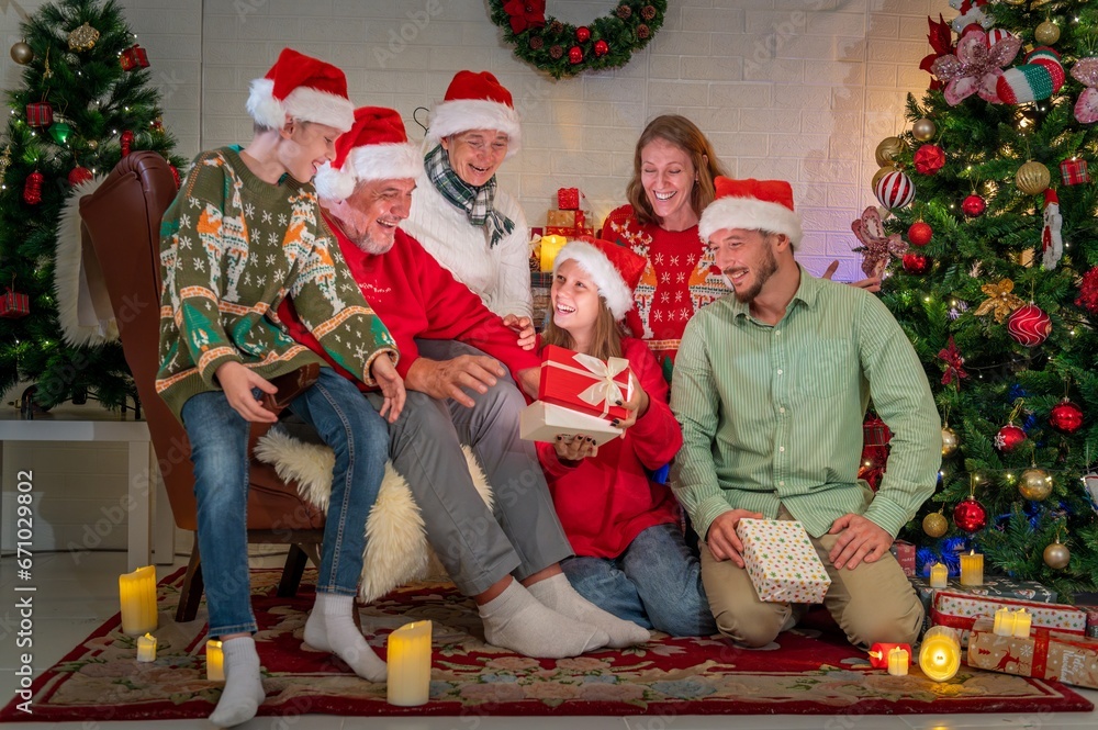 Family open Christmas surprised Present Gift Box front of Xmas Tree interior magic Lighting glowing tree. Merry Christmas! happy family and children fun magic gift near tree at evening at home.