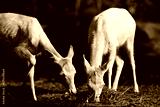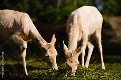 Dwie sarny jedzące trawę w zoo w słoneczny dzień