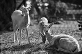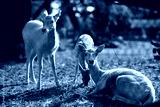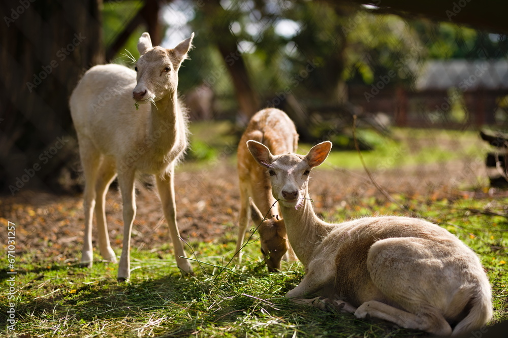 Sarna patrząca w obiektyw odpoczywająca na trawie w zoo w słoneczny dzień, w tle młoda sarna jedząca trawę i dorosła sarna