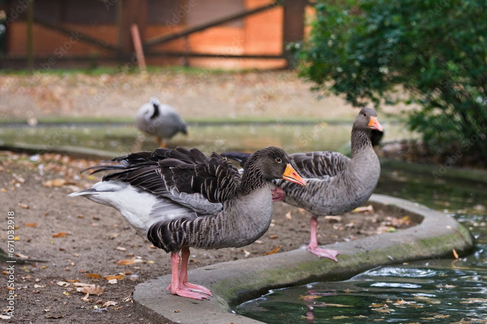 Dwie szare gęsi stojące na brzegu stawu w ogrodzie zoologicznym