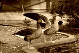 Dwie szare gęsi, jedna z rozpostartymi skrzydłami, stojące na brzegu stawu w ogrodzie zoologicznym