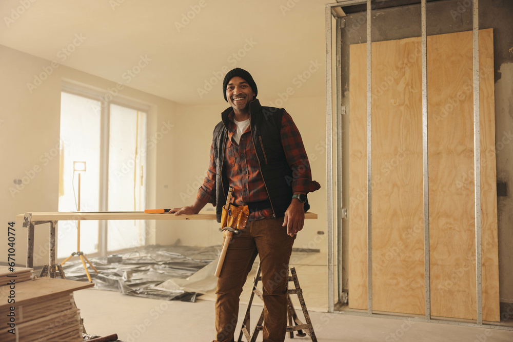 Mature construction worker wearing tool belt and renovating a home interior