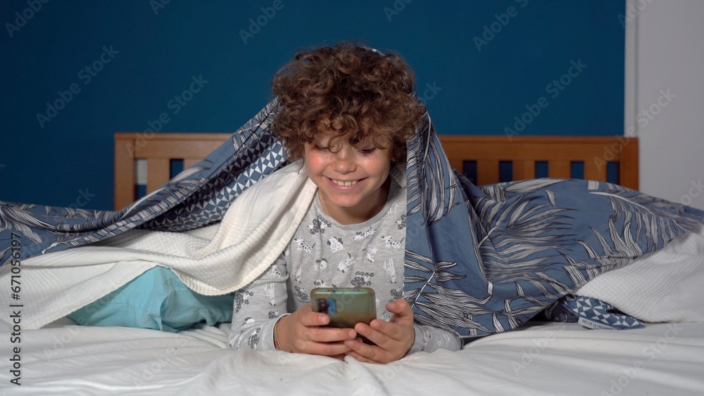 9 year old boy happy to stay in bedroom looking at the smart phone - addiction to social networks and the internet - spending too much time online during daily life