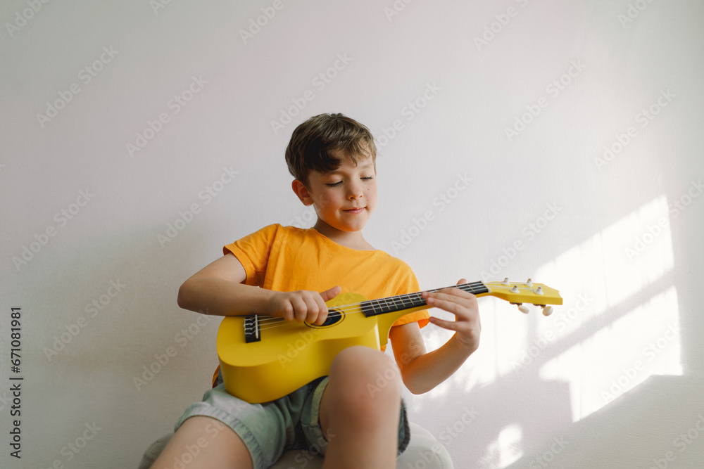 Cute boy learns to play the yellow Ukulele guitar in home. Cozy home. Summer holidays lifestyle.