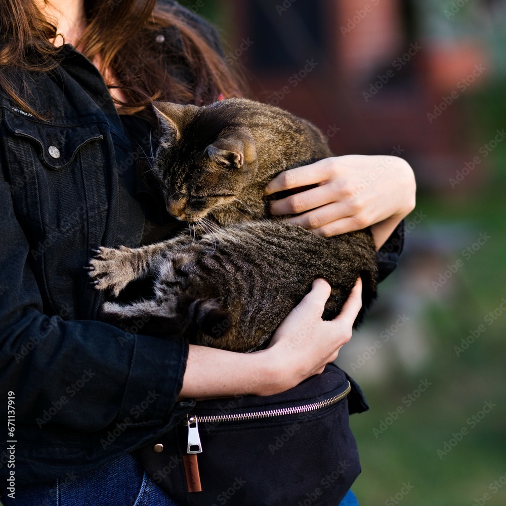 Bury kot wczepiający pazury w czarną jeansową kurtkę osoby trzymającej go na rękach