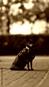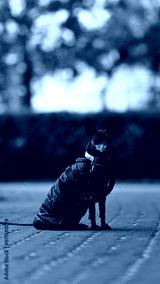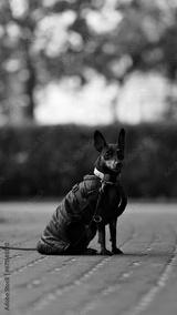 Niewielki czarny pies z dużymi uszami ubrany w czarną kurtkę puchową siedzący na chodniku przy sklepie
