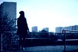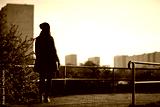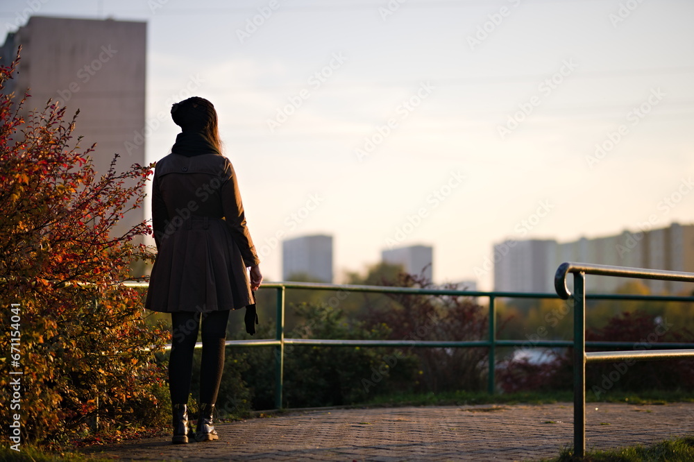 Kobieta ubrana w zielony płaszcz stojąca na pagórku w parku miejskim o zachodzie słonca, w tle zarys budynków mieszkalnych