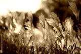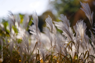 Trawy ozdobne bujające się na wietrze w parku miejskim w słoneczny jesienny dzień