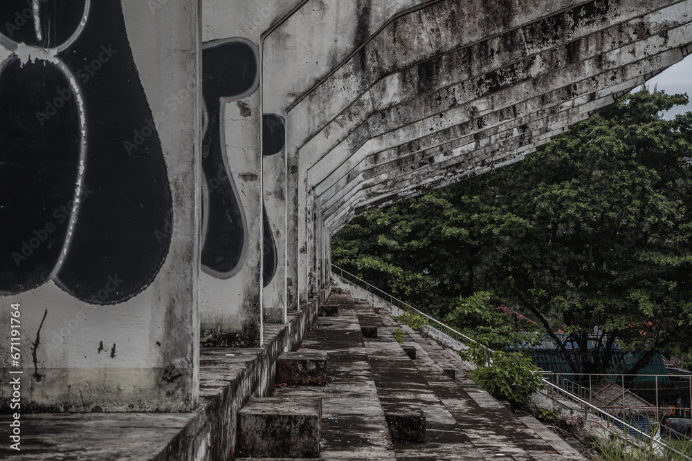 An old and shabby abandoned stadium. Plants grow in the stands. Gray cloudy day.