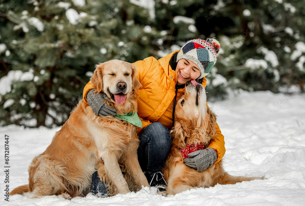 Golden retriever dogs in winter time with girl owner posing in snow. Young woman looking at camera with doggy pets in forest in cold weather