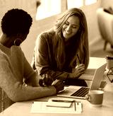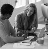 Collaboration, friends and students with a laptop at desk in university for learning knowledge. Teamwork, happy women and computer in college for education, research on internet and study for exam.