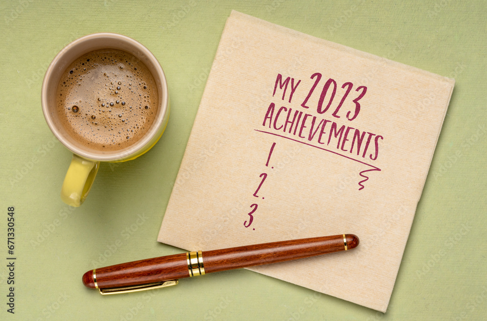 my 2023 achievements - blank list on a napkin, flat lay with a cup of coffee, personal review of the recent year