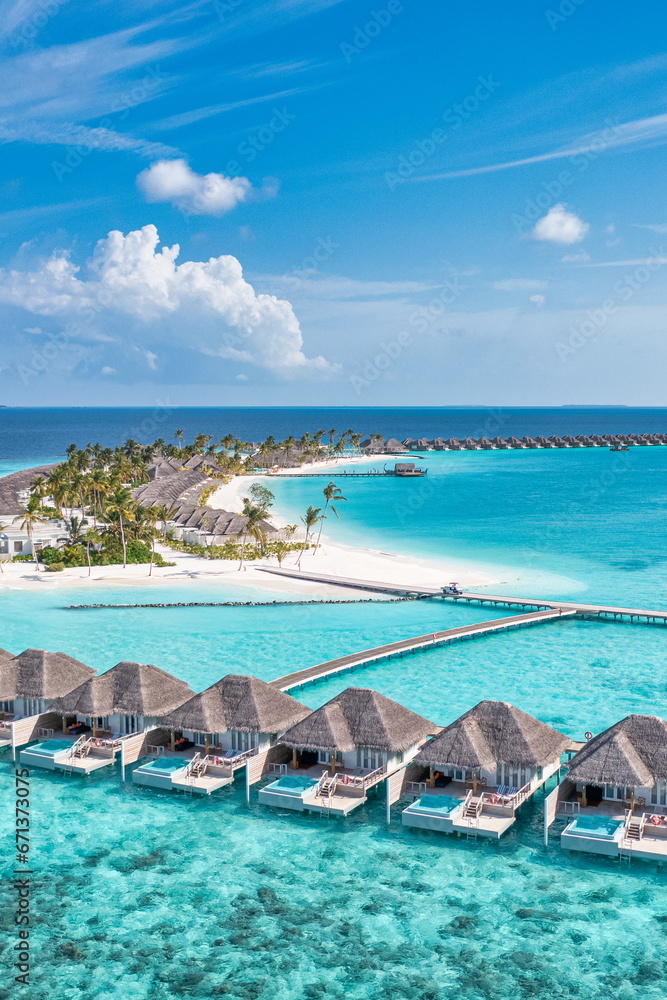 Picturesque aerial landscape luxury tropical island resort with water villas. Beautiful island beach palm trees, sunny sea sky. Amazing bird eyes view in Maldives paradise coast. Exotic best vacations