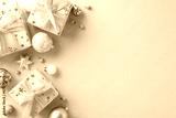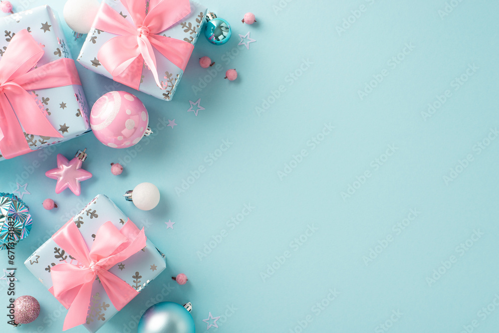 A glamorous winter holiday revelry featuring fashionable ornaments theme. Overhead photograph of baubles, elegant gift boxes with ribbons, holly berries on soft blue backdrop for text or promo content