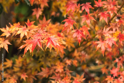 Vibrant red-orange leaves of a Japanese maple in autumn. Selective focus, earth tones, natural foliage background.