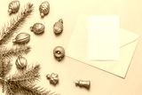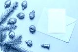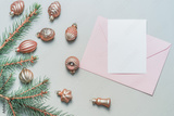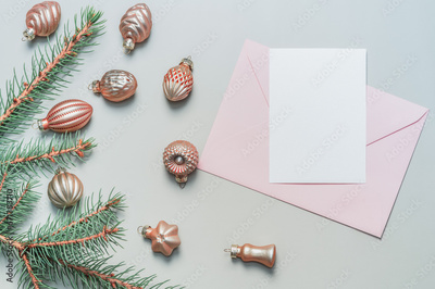 Pink envelope and blank form, Christmas tree toys on a greenish background. Christmas card, Merry Christmas greetings.