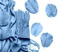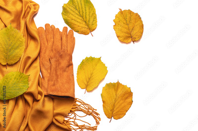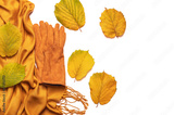 Yellow wool scarf, yellow gloves and yellow autumn leaves isolated on a white background. Comfortable bright clothes for the cold autumn-winter season. Bright autumn.