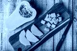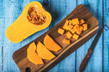 Pumpkin pieces on a cutting board and half a pumpkin, knife on a wooden blue background. Traditional autumn food. New harvest.