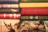 Autumn leaves on the table against the background of the library. Evening reading. Autumn hobby.