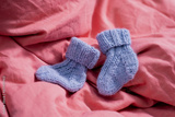 Little small blue knitted wool socks on a background of pink blanket. Symbol to young infant not yet born children, also gender reveal party idea
