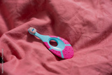 Children's toothbrush in pink bright colors for toddlers on pink blanket during sickness in home