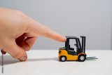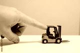 Mans arm pushing little toy forklift as symbol for keeping pushing the construction business