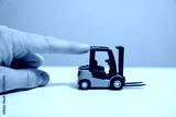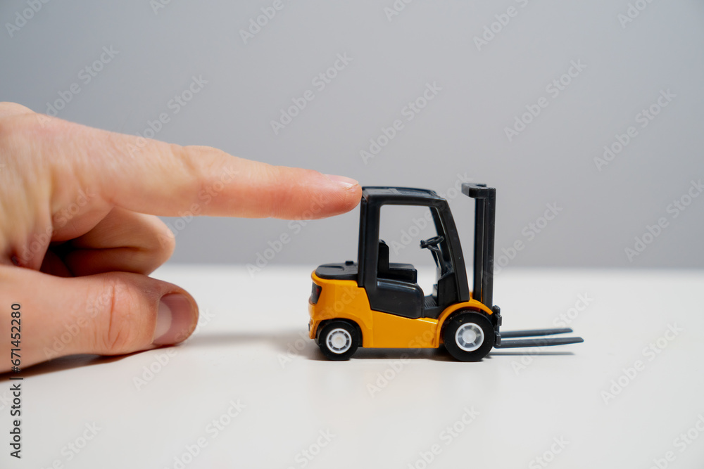 Mans arm pushing little toy forklift as symbol for keeping pushing the construction business
