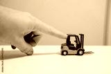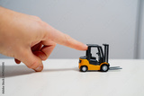 Mans arm pushing little toy forklift as symbol for keeping pushing the construction business
